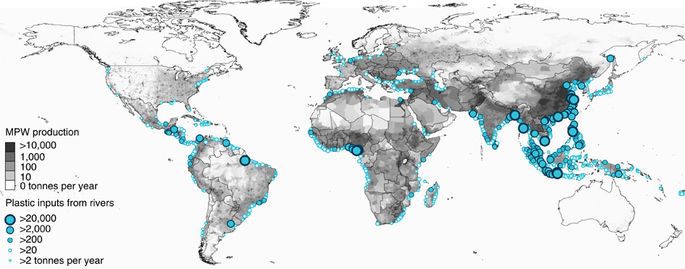 A recent study published in Nature Communications (https://www.nature.com/articles/ncomms15611) (funded by The Ocean Cleanup) calculated that roughly 2 million metric tons of plastic waste are swept into the ocean via rivers every year. The study further concludes that only 20 rivers (mostly in Asia) are responsible for 67% of this pollution.